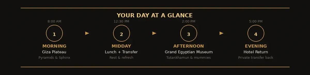 Morning: Giza Plateau — arrive before the crowds, work through the site in the right sequence, rest when needed.